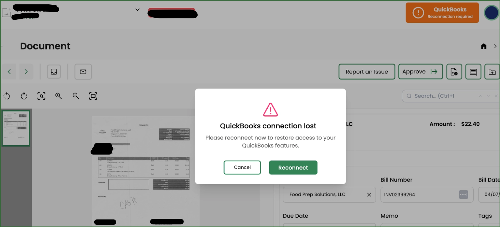 If your account gets disconnected from QuickBooks, the green connected button will turn orange and we will pop up a reminder message to reconnect.