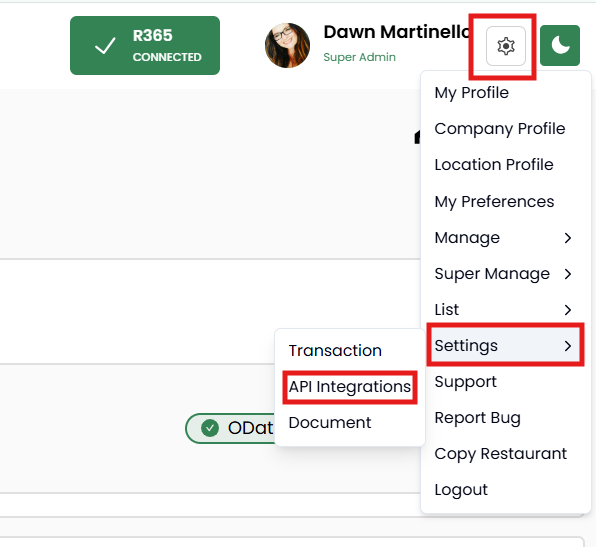 To add or edit your R365 OData or FTP credentials, click on the gear icon next to your name in the top right corner. Choose SETTINGS then API INTEGRATIONS.