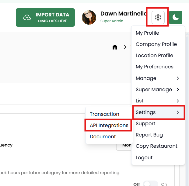 To connect your clickBACON account to R365, click on the gear icon next to your photo in the top right hand side of the screen. Click on SETTINGS then API INTEGRATIONS.