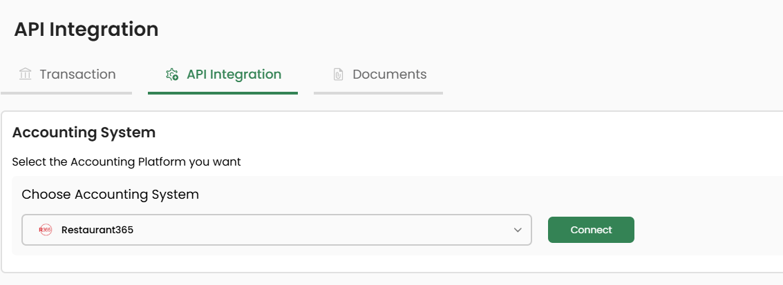Under Accounting System, choose Restaurant 365 from the dropdown list then CONNECT.