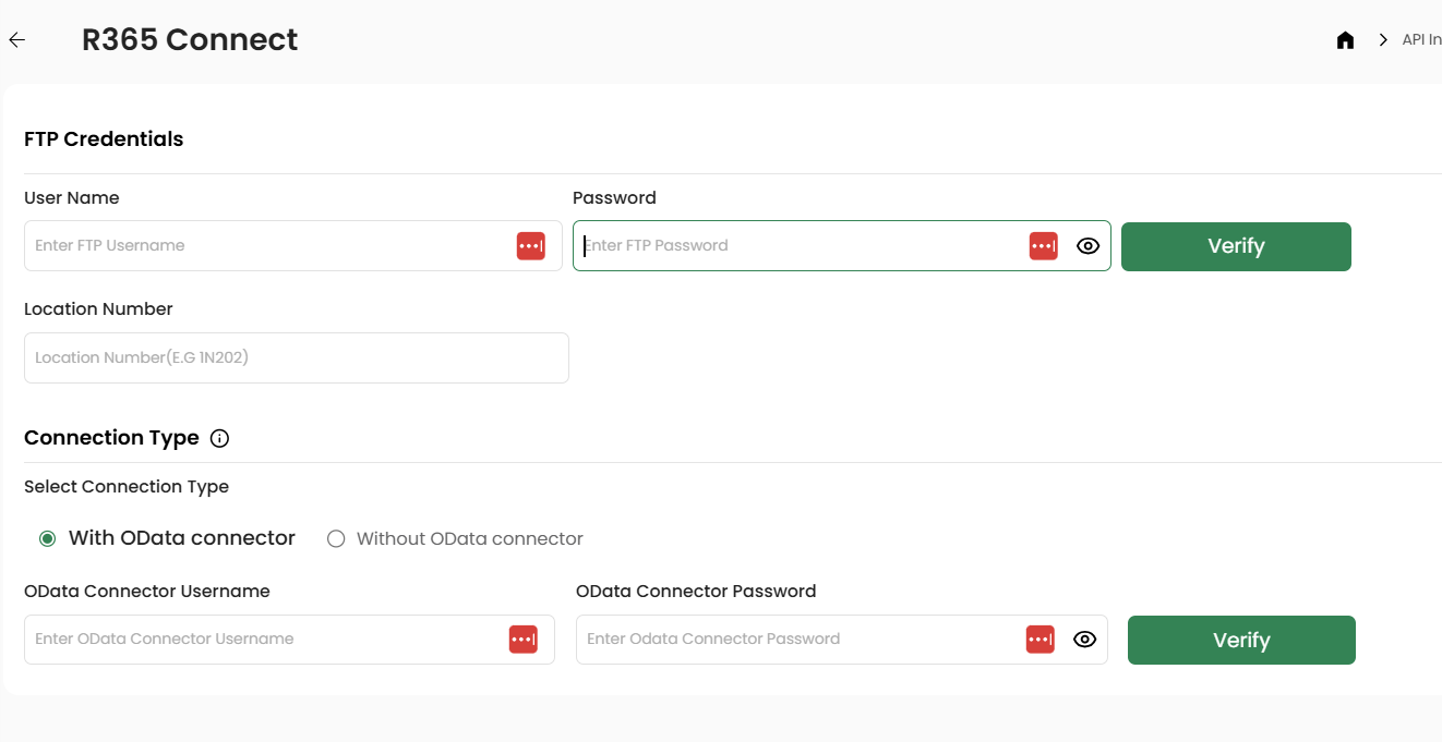 Enter your FTP credentials and OData credentials and click the VERIFY buttons next to each of them.